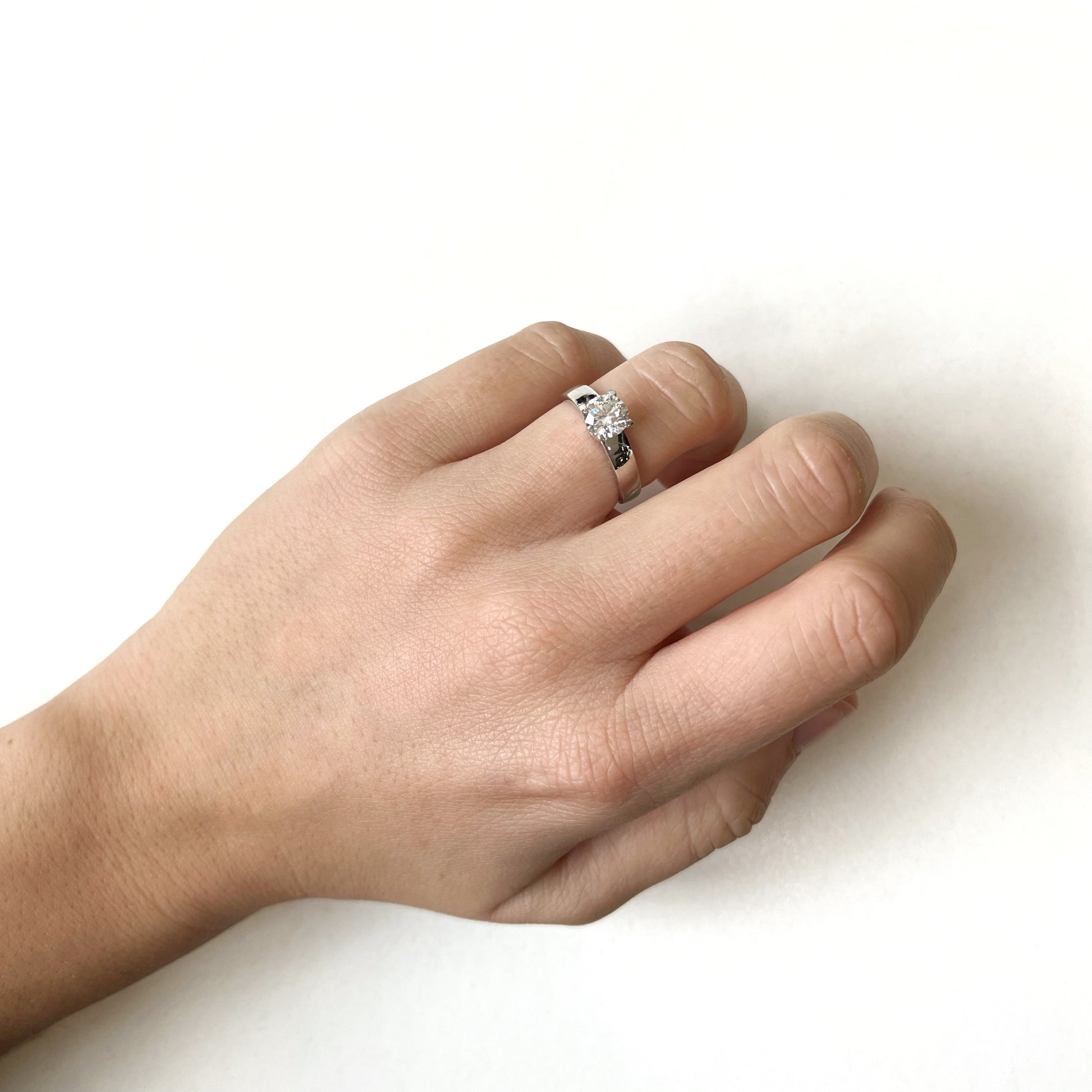 Anillo Solitario de Compromiso elaborado en Oro Blanco o Amarillo, con Diamante Creado sobre montura de 4 grapas.