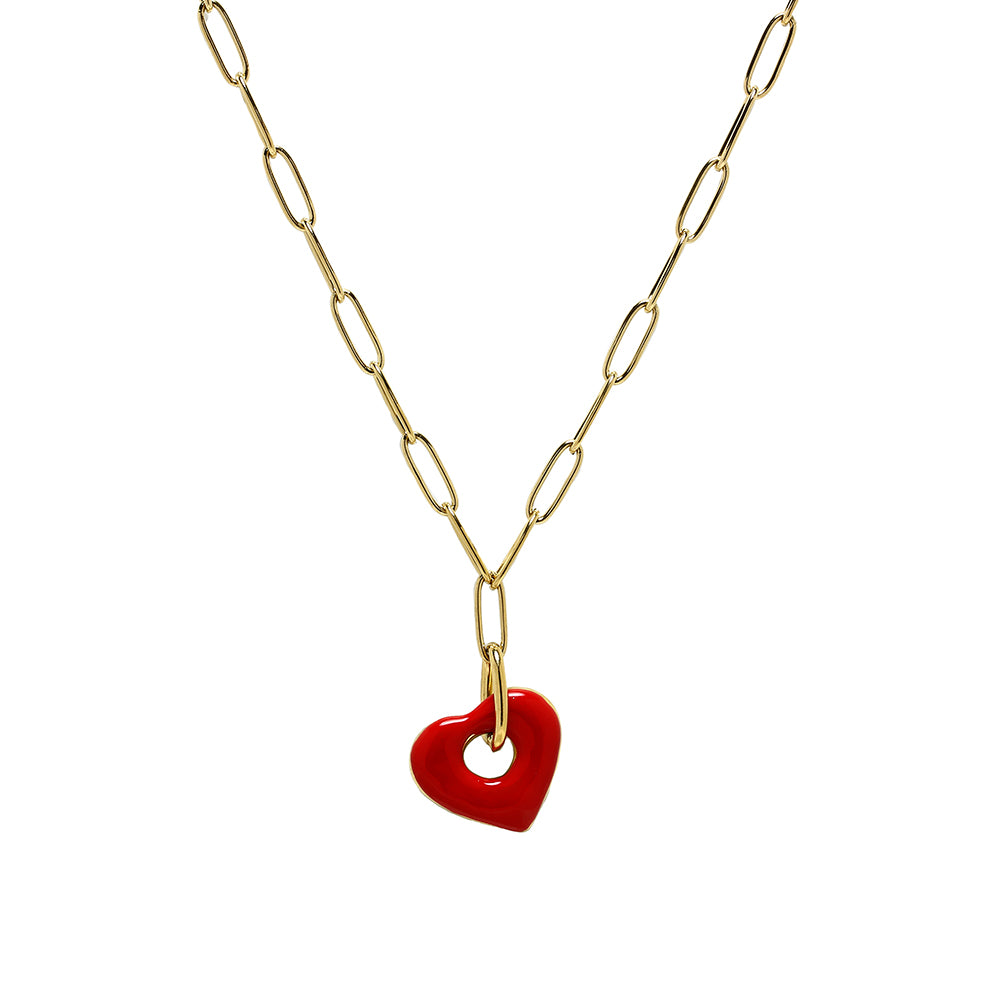La Cadena y Colgante Corazón en color rojo en acero de Tesi García combina un diseño romántico con un acabado vibrante y duradero. Perfecta para destacar tu estilo o regalar un detalle lleno de amor ❤️