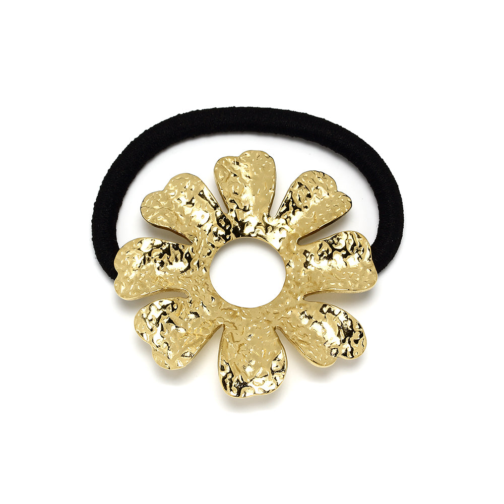 Coletero elástico con detalle en forma de flor metálica en acabado acero. Un accesorio resistente y elegante que combina practicidad con un diseño distintivo, ideal para realzar cualquier peinado con un toque moderno y delicado.