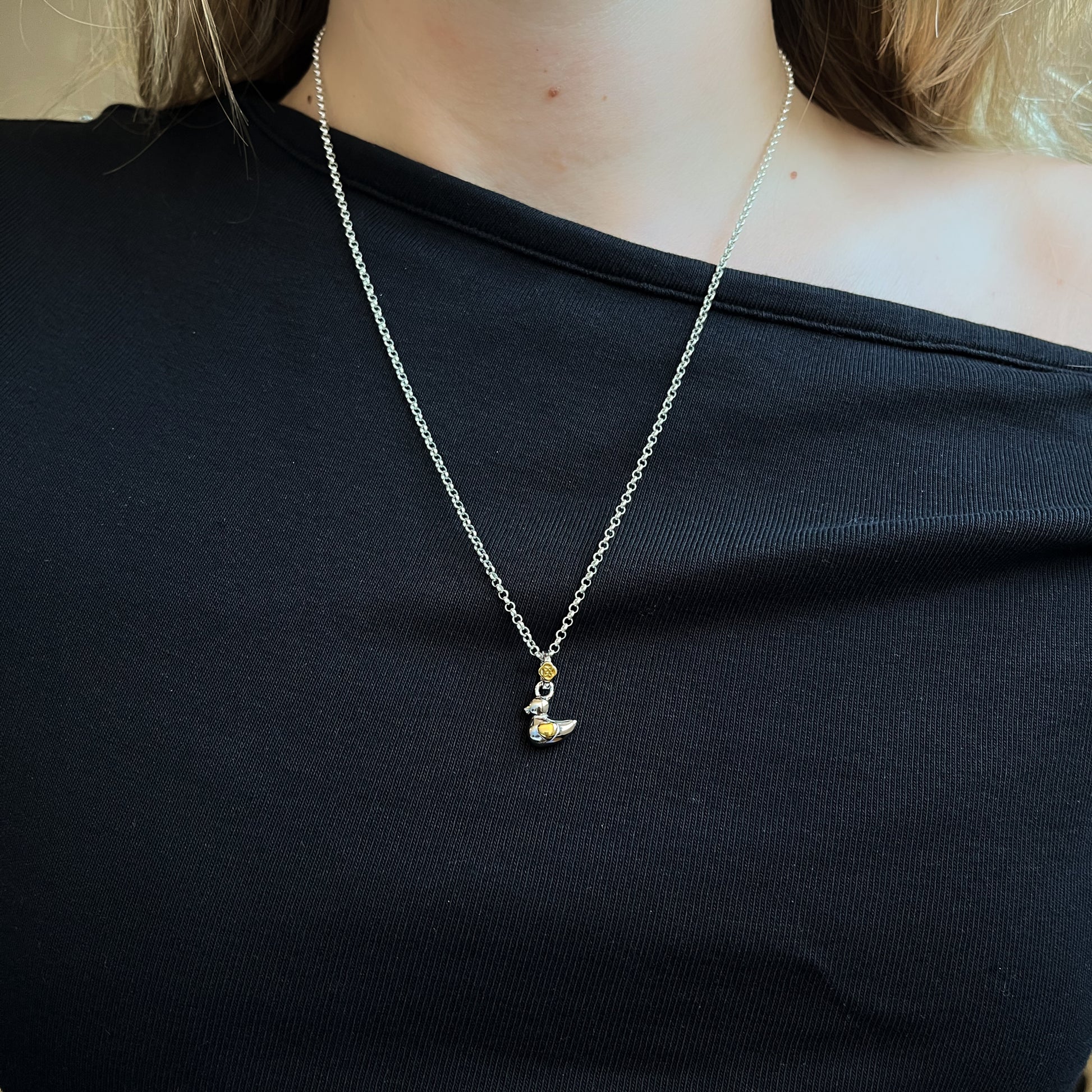 Este elegante colgante de patito en plata personalizable es el accesorio perfecto para el Día de la Madre.