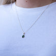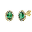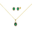 Elegante conjunto de pendientes y colgante con cadena, de diseño ovalado, elaborado en Oro Amarillo de 9 kilates. Destaca por el brillo de sus circonitas blancas y la elegancia de una circonita central color esmeralda, que aporta un toque de distinción y color.