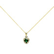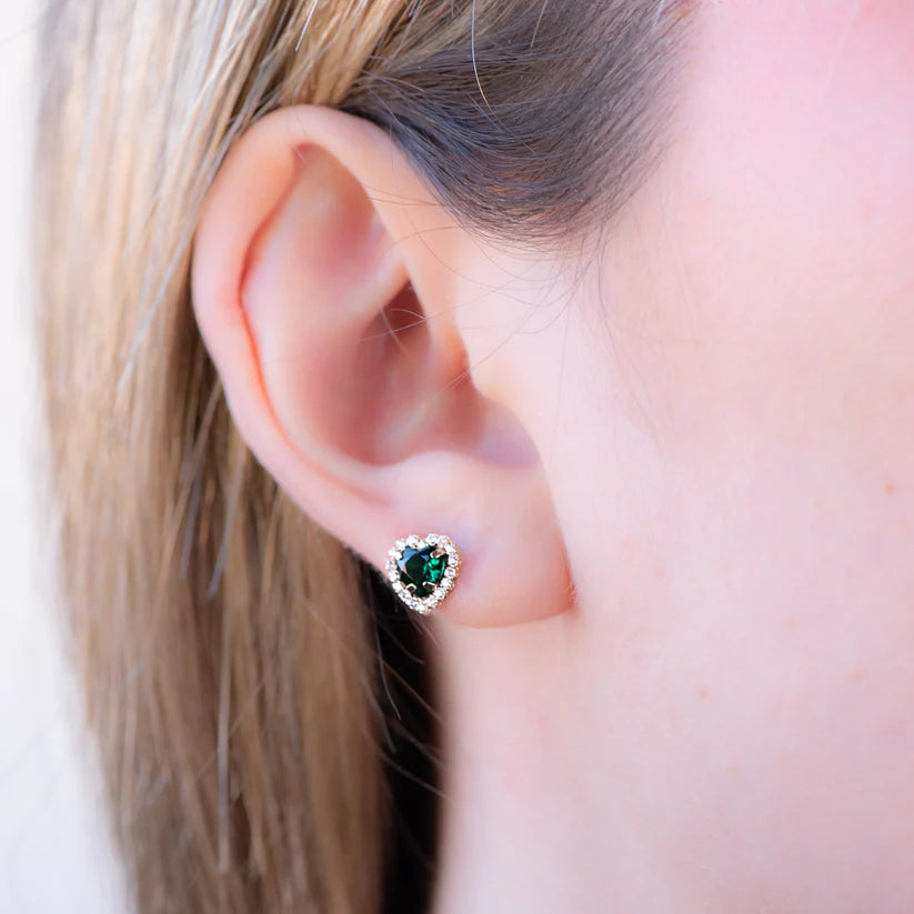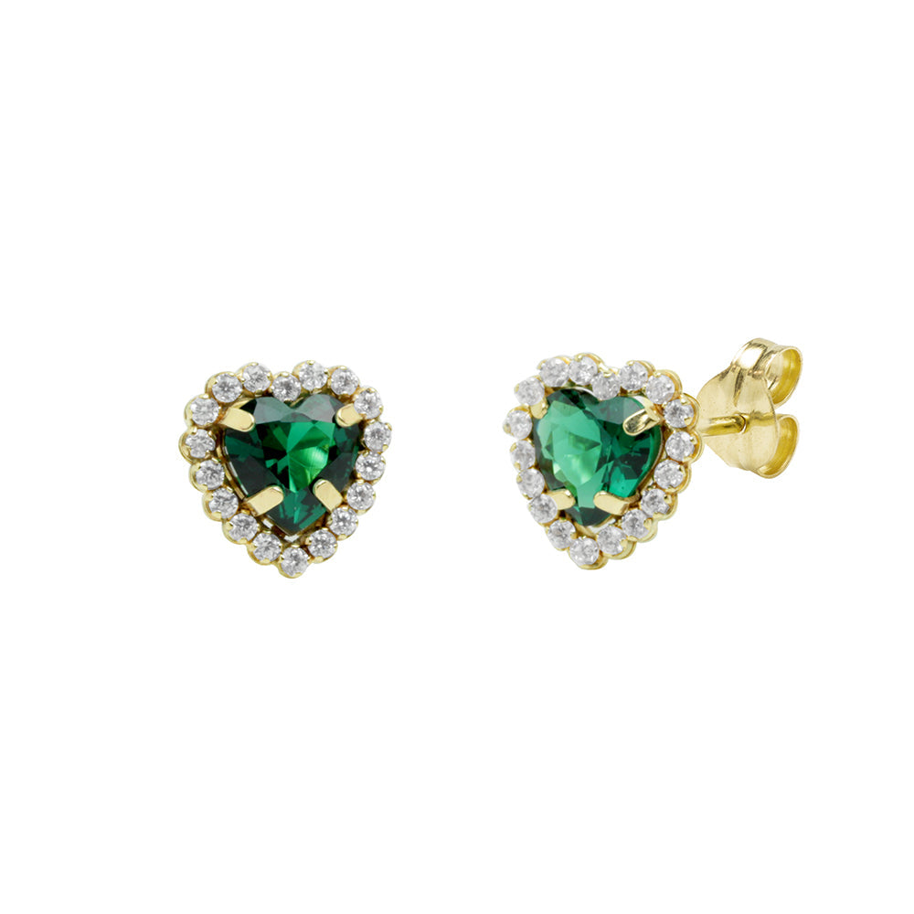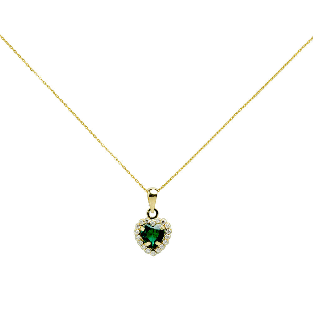 Conjunto de pendientes y colgante con cadena en forma de corazón, elaborado en Oro Amarillo de 9 Kilates. Adornado con una circonita central color esmeralda y pequeñas circonitas blancas que realzan su brillo y elegancia. Una joya delicada y llena de encanto.