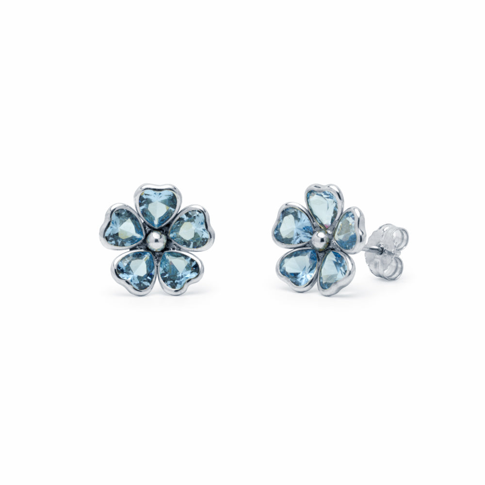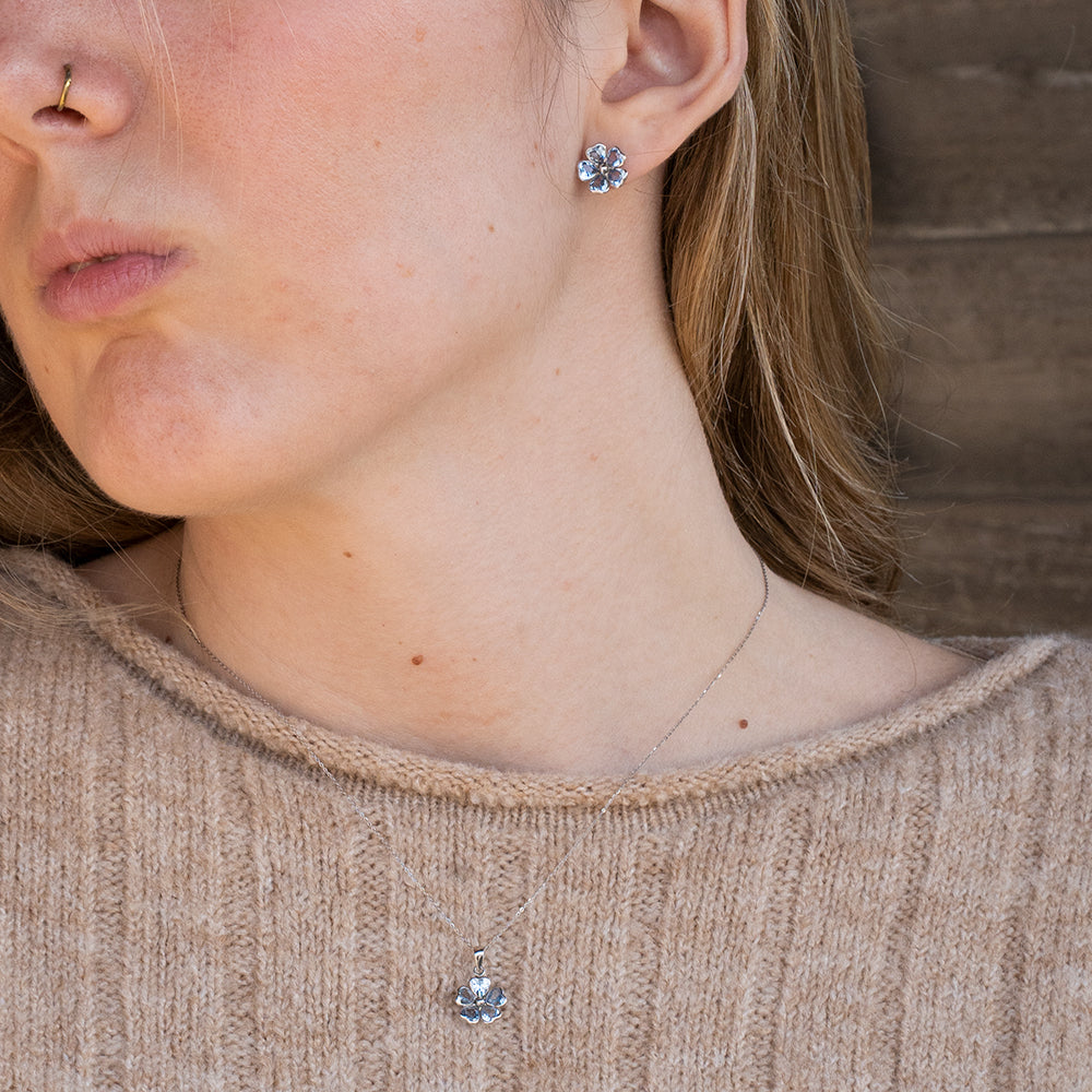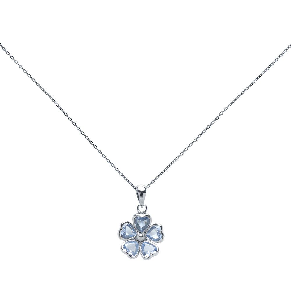 Conjunto de Cadena y Colgante y Pendientes con Flores de circonitas aguamarina, elaborada en Oro Blanco de 9 Kilates.
