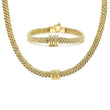 Conjunto de Cadena y Pulsera, elaborado en Oro Amarillo de 9 Kilates, con un eslabón ancho y un pequeño aplique en el centro. Un diseño clásico y sofisticado que aporta un toque de distinción atemporal, ideal para resaltar tu estilo con una elegancia perdurable.