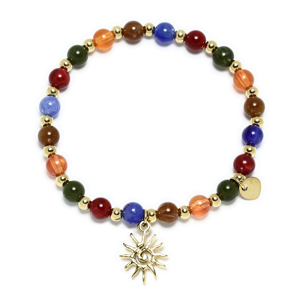 La Pulsera Sol Bolas de Colores Elástica de Tesi García aporta un toque alegre y juvenil, combinando bolas de colores con un detalle central en forma de sol. Su diseño elástico la hace cómoda y fácil de poner, ideal para dar luz a cualquier look ☀️.