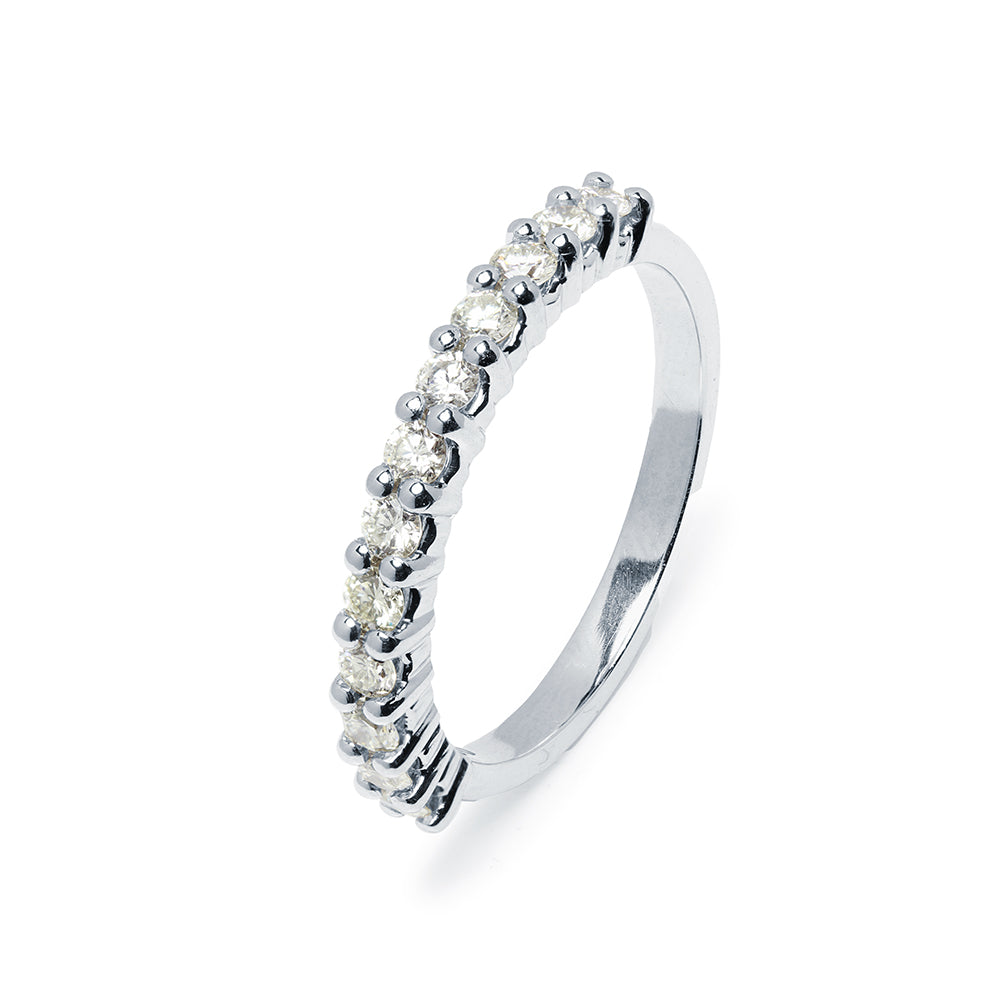 Celebra la elegancia atemporal con esta hermosa media alianza. Con 12 diamantes que suman 0.48 ct (H-SI) engastados en platino de alta calidad, ofrece brillo y durabilidad excepcionales. Su diseño de grapas combina sofisticación y sencillez, perfecta para complementar un anillo de compromiso o para momentos especiales.