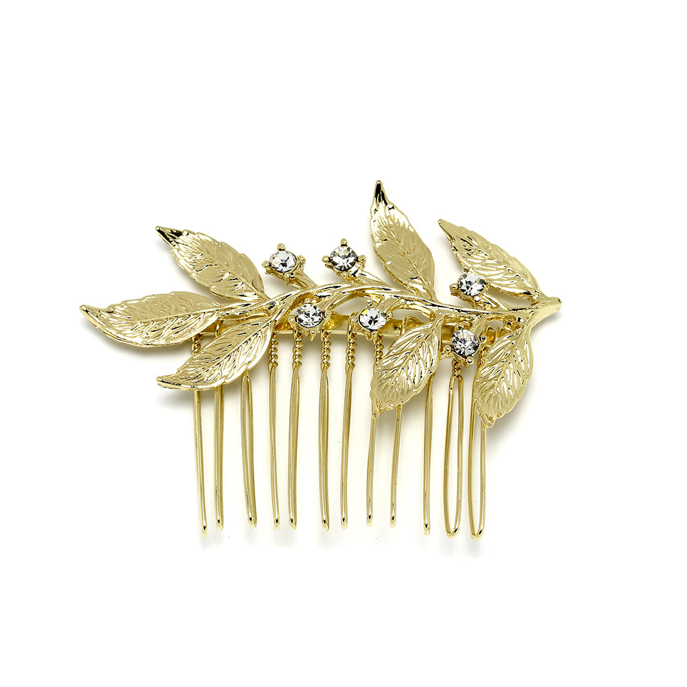 Peineta en acabado dorado con delicadas hojas texturizadas y pequeños cristales brillantes incrustados, que aportan un toque romántico y luminoso. Perfecta para novias o eventos especiales.