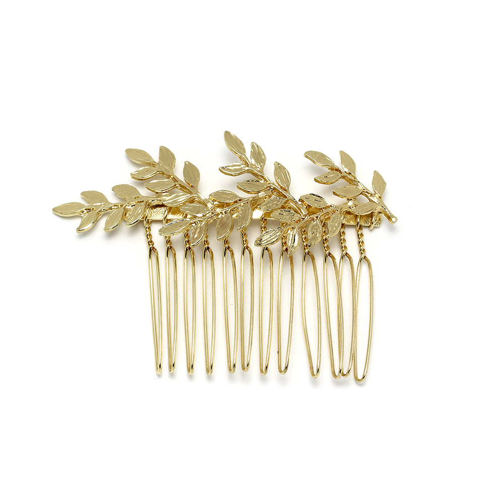 Peineta inspirada en ramas de laurel, con múltiples hojas doradas que aportan un estilo clásico y atemporal. Un accesorio versátil para dar un aire distinguido a cualquier peinado.