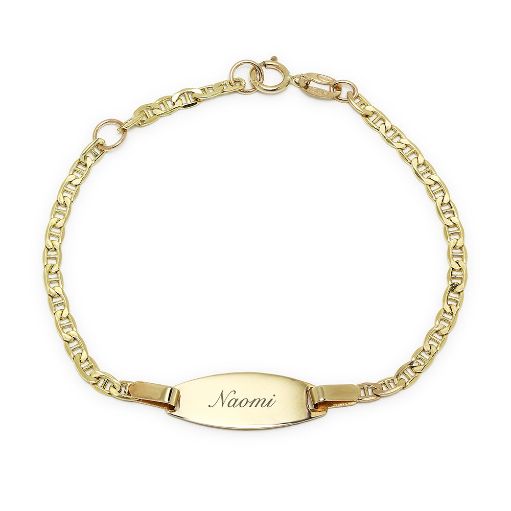 Pulsera Nomeolvides de Bebé con cadena Travesino y Placa Ovalada elaborada en Oro Amarillo de 9 Kilates.