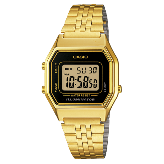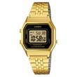 Reloj digital retro con cronómetro de 1/100 s (59'59,99"), alarma diaria, señal horaria, luz LED ámbar, calendario automático, precisión ±30 s/mes y formato 12/24 h.