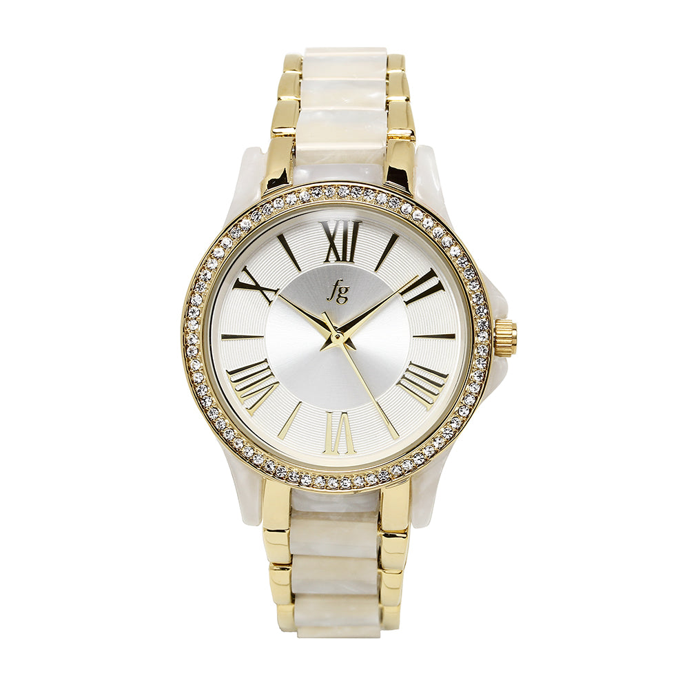 Reloj Fg Barcelona Bains destaca por su elegante esfera enmarcada por una línea de pequeñas circonitas que aportan un brillo sutil y refinado. Su correa con acabado estilo cerámica o mármol realza su diseño moderno, convirtiéndolo en el complemento perfecto para looks elegantes y actuales.