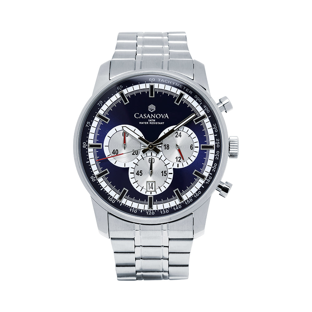 El Casanova Chrono Racer – Dark Blue Dial ofrece un diseño deportivo y moderno, con una esfera azul intensa combinada con detalles en blanco en los cronógrafos para un contraste elegante y una lectura clara de cada función.